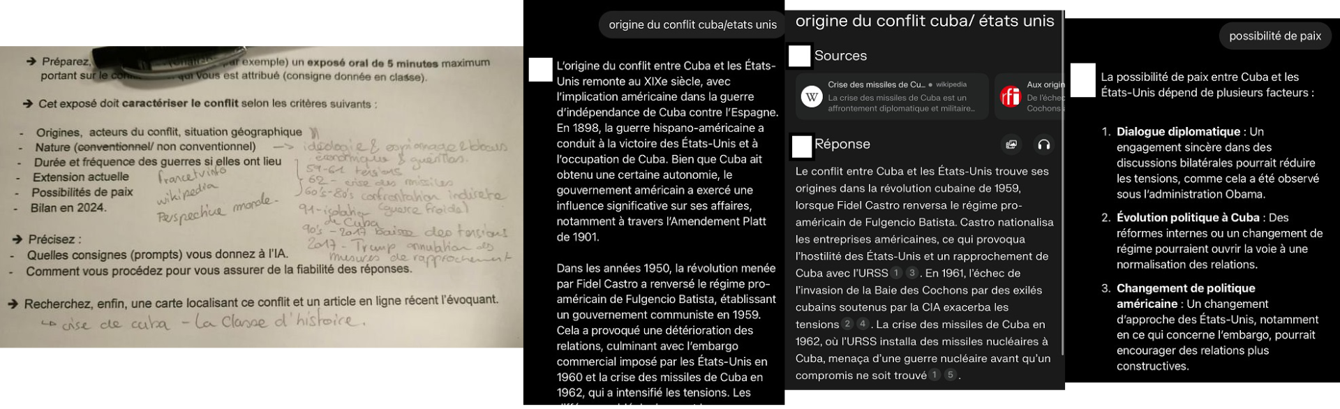 En début de séance, les objectifs de travail sont précisés. Une fiche de consignes est distribuée (voir doc annexe).  Le professeur attribue à chaque groupe (de 2 à 4 élèves) un conflit à étudier. Lorsque les groupes sont constitués de 4 élèves, il leur est proposé d’utiliser au moins deux IA conversationnelles pour pouvoir comparer les informations données.  Pour le groupe de 29 élèves, 10 objets d’étude sont proposés.
